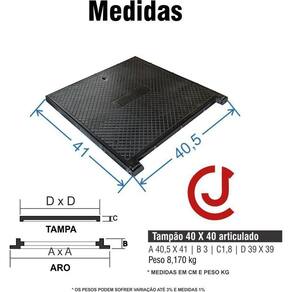 Kit 2 Tampa Eletrica Gordura Esgoto 40x40cm Ferro Articulada Especificações do produto Características técnicas: projetado para tampar, caixas de passagem de tubulação, esgoto, águas pluviais, água potável, redes de telecomunicações, eletricidade entre outros. Facilitando o acesso a válvulas, registros, quadro de distribuição. Produto Nome: Duas tampas de 40x40 articulado ferro. acompanha aro e tampa Indicação: caixas de passagem. Material: ferro fundido. Acabamento: pintura cor preta esmalte sintético . Modelo: articulado Garantia: 30 dias contra defeito de fabricação Peso: 8,170 kg Carga máxima nominal por eixo: 300 kg Suporta passagem de veículos leves em áreas de trafego baixo exemplo garagem e calçada. Marca: Casa E Jardim Comércio