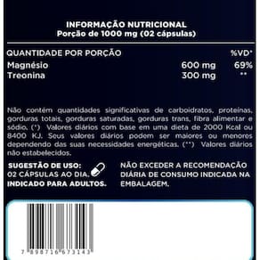 O TreonMax é fabricado com o mais alto padrão de qualidade, utilizando ingredientes cuidadosamente selecionados para garantir eficácia e segurança. Cada pote contém 60 cápsulas de 500mg, proporcionando um suprimento de 30 dias para a sua saúde e bem-estar. O TreonMax é uma escolha segura para indivíduos com sensibilidades alimentares, pois é formulado sem glúten e sem lactose. Para obter os melhores resultados, sugerimos o uso de 2 cápsulas ao dia, preferencialmente com uma refeição. O TreonMax é uma inovação na área de suplementação, combinando os benefícios do magnésio com a L-treonina em uma fórmula equilibrada e de alta qualidade. Cada porção de 1000mg 2 cápsulas oferece 600mg de magnésio, um mineral essencial para a saúde do corpo e da mente, e 300mg de L-treonina, um aminoácido que desempenha um papel importante na função cerebral e no bem-estar. Desenvolvido com base em pesquisas científicas, TreonMax é a revolução que você precisa para alcançar uma vida plena de bem-estar e realização. Marca: Treonmax Ean: 7798977642677