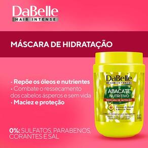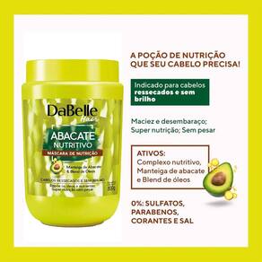 DaBelle Hair Máscara Abacate Nutritivo 800g Perfeito para cabelos ressecados e sem brilho: - Repõe os óleos e nutrientes- Super nutrição sem pesar- Devolve os óleos e os nutrientes essenciais para a fibra capilar- Retém a hidratação dentro do fio combatendo o ressecamento dos cabelos ásperos e sem vida- Traz o vigor e condicionamento com maciez e proteção- Repõe os lipídeos e combate o ressecamento- Protege, nutre com leveza, dá brilho e previne as pontas duplas" Necessidade: HidrataçãoTipo de cabelo: Normais e todos os tiposLinha: Abacate Nutritivo O que ele tem? MANTEIGA DE ABACATE:Rica em Vitamina E, repõe os lipídios e combate o ressecamento. BLEND DE ÓLEOS:Com Argan, Abacate, Macadâmia, Girassol e Linhaça. Uma combinação perfeita que protege, nutre com leveza, dá brilho e previne as pontas duplas. 0% PARABENOS | 0% CORANTES | 0% ÓLEO - Produto vegano- Não testado em animais Modo de uso: Após lavar os cabelos com o Shampoo, aplique por todo o cabelo uma quantidade suficiente para eluvar os fios. Massageie em direção às pontas e penteie delicadamente com os dedos ou com um pente de dentes largos. Deixe agir por 3 minutos e enxágue bem. Se preferir uma nutrição mais potente, use touca por 5 minutos. Combine com outros itens da linha DaBelle Hair para ter um resultado ainda mais incrível! Resultado: Traz de volta a vida e a maciez que seus cabelos amam de paixão! Ean: 7898965666989