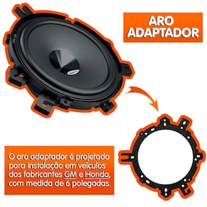 CONTEÚDO DA EMBALAGEM: - 1 PAR de Alto Falante 6 Polegadas; - 1 PAR de Tweeter - 1 PAR de Aro adaptador - 1 Chicote de Ligação - Acessórios de Instalação