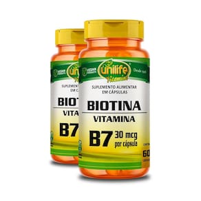 O que é a Vitamina B7 Biotina da Unilife A vitamina B7 Biotina da Unilife faz parte do complexo de Vitamina B, todas vitaminas do complexo B não são produzidas pelo corpo, ou seja precisamos adquirir ela por dietas, entretanto a Vitamina B7 está presente na maioria dos alimentos, mas ela é umas das mais ausentes em todos os organismo, isso acontece devido ela ser muito frágil, e no seu processamento pode ser destruída com muita facilidade e assim perdemos todos seus nutrientes, o que nos resta é suplementar a Vitamina B7 Biotina para obter a quantidade exata sem nenhuma preocupação, pois a carência de B7 pode afetar diretamente o sistema nervoso, coração, e a função digestiva. Como utilizar a vitamina Biotina B7 da Unilife A fabricante Unilife recomenda a utilização de 1 cápsula diária após a principal refeição do dia, deve-se consumir juntamente com líquidos para melhor absorção pelo organismo. A equipe da Edin adverte que qualquer alteração dessa dosagem deve ser feito com um acompanhamento nutricional adequado. Marca: Não Informado