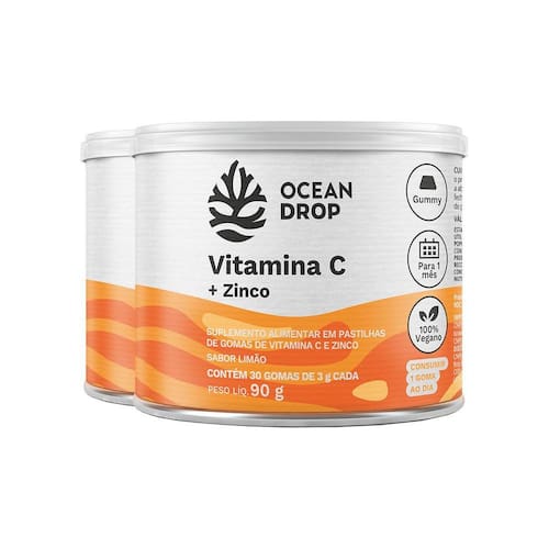 Kit 2 Vitamina C + Zinco Ocean Drop 30 Gomas Sabor Limão A vitamina C e o zinco são nutrientes essenciais que ajudam no funcionamento do sistema imune e atuam como antioxidantes. - Sabor: Limão. Composição: - Tapioca orgânica, água, açúcar de cana natural, ácido ascórbico vitamina C , citrato de zinco zinco , gelificante pectina, acidulante ácido cítrico, corante natural de curcumina, regulador de acidez citrato de sódio, aroma natural de limão. - NÃO CONTÉM GLÚTEN. Benefícios: - Antioxidante. - Fortalece a imunidade. Modo de Consumo: - Sugere-se a ingestão de 1 goma ao dia ou conforme recomendação . Contraindicações: - Para maiores de 19 anos. - Não recomendado para gestantes, lactantes e crianças. - Este produto não é um . Informações adicionais: - Produto dispensado de registro conforme RDC 240/2018 ANVISA. Marca: Não Informado Ean: 7908609532683