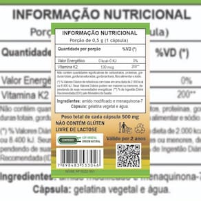 A Vitamina K2 Menaquinona MK7 Unilife 60 Cápsulas é um suplemento alimentar desenvolvido com ingredientes cuidadosamente selecionados para garantir qualidade e pureza. Cada cápsula contém menaquinona-7 Vitamina K2 e amido modificado, proporcionando uma opção prática para complementar a alimentação diária. A cápsula é composta por gelatina vegetariana e água, tornando o produto adequado para diferentes perfis de consumo. Ingredientes: Menaquinona-7 Vitamina K2 , amido modificado, gelatina vegetariana e água Informações adicionais Não contém glúten Não contém lactose Produto vegano Modo de uso: Sugere-se a ingestão de 1 cápsula ao dia, preferencialmente após a refeição, acompanhada de líquido. Informação nutricional Cada porção de 0,5 g 1 cápsula contém 65 mcg de Vitamina K2, correspondendo a 100% da necessidade diária recomendada. Armazenamento Manter em local seco e fresco, ao abrigo da luz e umidade. Após aberto, consumir dentro do prazo de validade indicado na embalagem. Marca: Não Informado