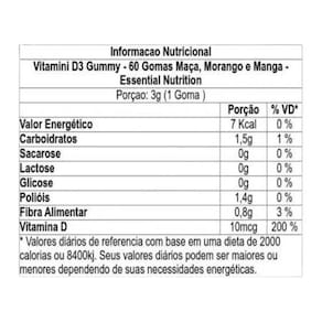 Kit 2 vitamini c essential nutrition 60 gomas A vitamina c está sempre presente nas etapas do desenvolvimento infantil. E sabe onde podemos encontrá-la Nas frutas como a laranja, o limão, a acerola e também nas gominhas vitamini c. A vitamina c auxilia no funcionamento do sistema imune, no metabolismo energético, na absorção de ferro dos alimentos e é um antioxidante que ajuda na proteção dos danos causados pelos radicais livres.Vitamini c gummy foi pensada especialmente para as crianças. São gominhas de morango, de manga e de maçã verde. E o melhor: todas sem açúcar, glúten, lactose, conservantes, corantes e aromas artificiais. Experimente essas gominhas vitaminadas e deliciosas A infância é uma fase de crescimento e desenvolvimento e um dos momentos mais importantes de nutrição. É essencial ter bons níveis de vitaminas para brincar, aprender e aproveitar a melhor fase da vida.A vantagem da alta absorção de vitamini c: investimos tempo, pesquisa e tecnologia para oferecer a vitamina c de forma mais eficiente para o corpinho dos pequenos. Vitamini c possui vitamina c revestida que é liberada somente no intestino, garantindo uma absorção superior. Ingredientes: sabor maçã verde: xarope de fibra de tapioca, gelatina, vitamina c revestida, agente de massa xarope de maltitol, edulcorantes xilitol e estévia, acidulante ácido cítrico, aroma natural de maçã verde, glaceante cera de carnaúba, corante natural clorofila. Não contém glúten. Sabor manga: xarope de fibra de tapioca, gelatina, vitamina c revestida, agente de massa xarope de maltitol, edulcorantes xilitol e estévia, acidulante ácido cítrico, aroma natural de manga, glaceante cera de carnaúba, corante natural betacaroteno. Não contém glúten. Sabor morango: xarope de fibra de tapioca, gelatina, vitamina c revestida, agente de massa xarope de maltitol, edulcorantes xilitol e estévia, acidulante ácido cítrico, aroma natural de morango, glaceante cera de carnaúba, corante natural antocianina. Não contém glúten. Sobre a marca: a essential nutrition é especializada no desenvolvimento de suplementos alimentares, funcionais e nutrição. Cada produto nosso é muito mais que um produto: é um desejo de algo grandioso para a sua vida. É um manifesto pelo desenvolvimento pessoal com mais qualidade de vida. É por isso que todos os ingredientes que estão, e também os que não estão em nossas fórmulas foram pensados, estudados e fazem parte dos nossos princípios de nutrição. Esse mesmo propósito é compartilhado com médicos e nutricionistas, além de esportistas e pessoas que buscam uma alimentação equilibrada, associada a um melhor estilo de vida. Essas pessoas nos motivam diariamente a continuar desenvolvendo produtos de alta qualidade e inspirando cada vez mais pessoas a viverem melhor. Curadoria: nossos produtos são criteriosamente validados pela nossa curadoria de produtos saudáveis, que busca produtores e empresas que compartilham do nosso alto padrão de qualidade. Da enorme lista de ingredientes banidos à preocupação do bem estar animal, desde o primeiro dia seguimos fieis aos nossos valores, trabalhando com transparência e práticas sustentáveis. Vendemos apenas produtos que admiramos e que nos orgulha.ANVISA: Registro ISENTO conforme resolução RDC 27 de 06 de agosto de 2010 anexo I.