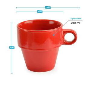 - Capacidade de 210ml, ideal para bebidas longas como cappuccino - Feitas de cerâmica de alta qualidade, resistentes e duráveis - Design empilhável para economizar espaço na sua cozinha - Acabamento esmaltado vermelho, combinando com diversos estilos de decoração - Fáceis de limpar, podendo ir na lava-louças