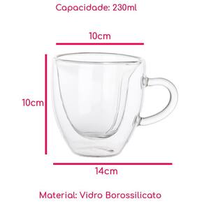 Características: Altura: 10cm Diâmetro: 10cm Comprimento com alça: 14cm Capacidade: 230ml Material: Vidro Borossilicato Marca: Class Home Conteúdo: 2 Xícaras