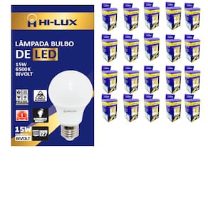 20 - LÂMPADAS LED BULBO 15W 6500KA linha de lâmpadas LED HILUX é indicada para retrofit de lâmpadas incandescentes ou fluorescentes, em diversos tipos de aplicações para ambientes internos.PROPRIEDADES¿ Lâmpadas certificadas pelo INMETRO.¿ Formato similar às lâmpadas incandescentes tradicionais.¿ Corpo em policarbonato branco e difusor em policarbonato branco leitoso.¿ Possui driver interno isolado.CARACTERÍSTICAS DE FUNCIONAMENTO¿ Temperatura ambiente: -5°C a 40°C.¿ Tensão de entrada: 100V a 240V.ESPECIFICAÇÕES TÉCNICAS¿ Base : E27¿ Tensão : Bivolt Automático 100V - 240V¿ Ângulo de abertura : 180 graus¿ Potência : 15W¿ Fluxo Luminoso : 1350 Lumens¿ Temperatura de cor : 6500K¿ Emissão de cor : Branca¿ Equivalência : Incandescente 75w / Fluorescente 20W¿ Dimensões : 108mm x 60mm