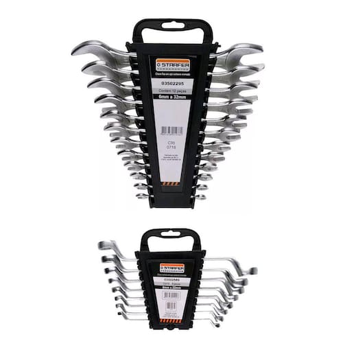 Jogo de chave fixa com 12 peças. 6mm a 32mm com 12 Peças Aço Carbono Cromado Composição: 6x7, 8x9, 10x11, 12x13, 14x15, 16x17, 18x19, 20x22, 21x23, 24x26, 25x28 e 27x32mm Ref.: 03502295 Material: Aço carbono Acabamento: Cromado Garantia: 30 dias contra defeito de fabricação Marca: Starfer Ean: 7891638005498