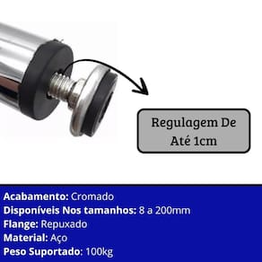 CARACTERÍSTICAS DO PRODUTO: Regulagem ajustável: até +1cm, garantindo nivelamento em qualquer superfície. Material: Metal de alta resistência e durabilidade. Design: Moderno, redondo e cromado, ideal para diversos estilos de decoração. Fixação segura: 4 parafusos por pé para máxima estabilidade. Capacidade de carga: Suporta até 100kg por pé.