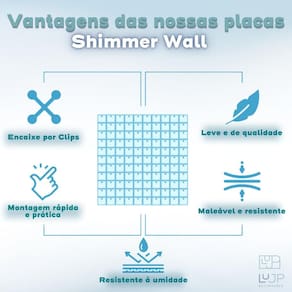 As placas de Shimmer Wall podem ser encaixadas uma na outra Sim As placas de Shimmer Wall possuem um sistema de clique, onde uma parte se prende facilmente à outra, permitindo que você crie superfícies maiores de forma prática, sem desperdício e com total segurança.