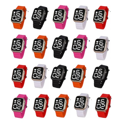 Relógio Digital Esportivo Ultra-Leve Led Ultr O dispositivo está sempre pronto para lhe mostrar as horas e data através de um simples toque no botão lateral e depois de segundos sua tela apaga deixando o layout em Black Piano à mostra Especificações - Estilo: Esporte e casual - Material da caixa: PC plásticos - Material da pulseira: Silicone - Pulseira removível: Sim (possibilita a troca) - Movimento: Digital - Funções: Apenas hora, data e segundos Modo de uso: Primeiro acenda a tela do relógio apertando apenas uma vez o botão lateral, depois de soltar, aperte novamente e mantenha-o pressionado até o número de cima (hora) começar a piscar - nesse momento você apertará algumas vezes esse botão até encontrar a hora desejada e em seguida basta manter pressionado novamente para fazer a alteração dos minutos.\nQuando finalizar fará o mesmo processo para alterar a data – vale lembrar que nesse relógio a data é mostrada no padrão americano, ou seja, mês em cima e dia abaixo. O que vem na embalagem 1 Kit 20 Relógio Digital Esportivo Ultra-Leve Led Ultra