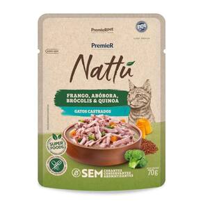 Ração Úmida Premier Nattu Sachê Gatos Castrados Frango, Abóbora, Brócolis e Quinoa 70g