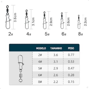 Sabe aquelas iscas artificiais que adoram brincar de dar nó na sua linha? Com o Girador Lorben, isso é coisa do passado! Seja utilizando hélices, colheres ou outras iscas que costumam torcer a linha, o Kit 210 Snap Girador Lorben proporciona uma troca rápida e sem complicações. Com um corpo em liga de cobre, anel sólido em aço inoxidável e giro super 360°, este kit foi projetado para enfrentar as águas com maestria.