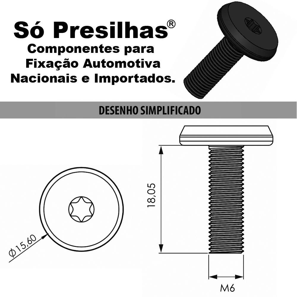 Especificação Técnica: Parafuso Fabricado em Metal de Alta Resistência Alta Durabilidade Fácil Instalação Ótimo Acabamento Encaixe Perfeito Medidas: Corpo 18,05mm / Cabeça 15,60mm / Furo M6 Produto Similar ao da Montadora