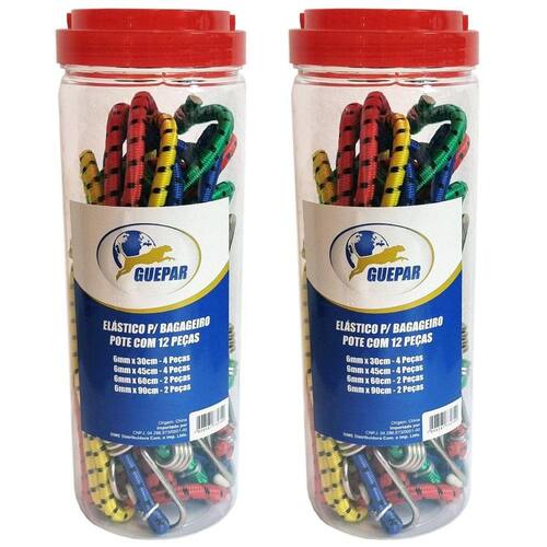 Kit 24 Elásticos para Bagageiro Carga Moto Bike Gancho MetalO elástico para bagageiro é ideal para prender objetos em motos, carros, bicicletas, carrinhos de mão entre outros. Possui corpo em borracha, polipropileno e aço e possui gancho nas pontas.- Marca: Guepar- Referência: 861-1369-2X- Indicado para diversas formas de uso como amarrar carga, bagagens, entre outros- 8 Elásticos 30cm x 6mm- 8 Elásticos 45cm x 6mm- 4 Elásticos 60cm x 6mm- 4 Elásticos 90cm x 6mm- Indispensável para amarração e segurança no transporte de cargas com bicicletas, carrinhos de mão, moto, pick ups, caminhonetes, bagageiro de carros, como camping, pesca, motociclismo, paraquedismo, asa-delta, etc...- Fabricada em borracha trançada de alta resistência revestido com fibra- Ganchos de aço carbono com acabamento em zinco- Pontas dos ganchos revestidos com borracha para não danificar os veículos- O Cabo de Elástico Extensor é fácil de usar e ajustar, pois tem ganchos em cada ponta que ajudam a prender os objetos de forma segura e prática.- Garantia: 90 dias