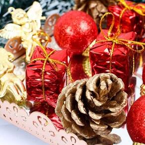 Composto por 24 unidades, o kit inclui 6 bolas, 6 pinhas, 6 presentes e 6 anjos. Cada peça é feita de poliestireno e espuma, garantindo durabilidade e resistência. As cores predominantes são vermelho e dourado, trazendo um brilho especial para sua árvore de Natal.
