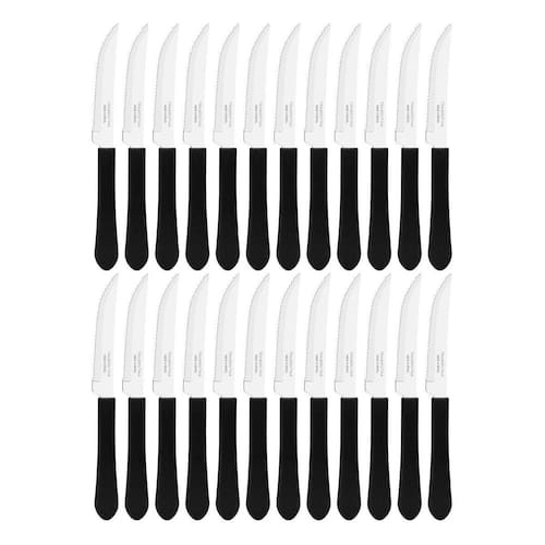 conteúdo do kit: 24 - facas de mesa churrasco tramontina leme inox cabo preto. Características do produto: lâmina: em aço inox; cabo: polipropileno preto. Dimensões produto compr. X larg. X alt. : comprimento: 20,2 cm largura: 0,9 cm altura: 1,8 cm