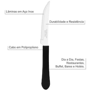 Kit 24 Facas de Mesa Churrasco Tramontina Leme Inox Cabo Preto Você que precisa de talheres de qualidade na hora de receber seus convidados Agora você tem a Faca de Mesa Churrasco Tramontina Leme Inox Cabo Preto é perfeita para essa ocasião. A Faca é produzida com lâmina em aço inox tem maior durabilidade do fio devido ao tratamento térmico e possui cabo em polipropileno proporcionando maior durabilidade e resistência para o uso no seu dia a dia. Além de tudo isso, pode ir à máquina de lavar louças facilitando seu dia a dia ainda mais. Este modelo é ideal para ser Utilizado em festas, restaurantes, buffet, bar e hotéis. Legal né Compartilhe com seus Amigos Conteúdo do Kit: 24 - Facas de Mesa Churrasco Tramontina Leme Inox Cabo Preto. Características do produto: Lâmina: Em Aço Inox; Cabo: Polipropileno Preto. Dimensões Produto Compr. X Larg. X Alt. : Comprimento: 20,2 cm Largura: 0,9 cm Altura: 1,8 cm TAGS e palavras chave do produto: Imagens ilustrativas. Os objetos que ambientam as imagens, não acompanham o produto. Fique atento: As cores das imagens podem sofrer alterações devido a luminosidade, configurações do monitor e até mesmo a percepção do usuário.