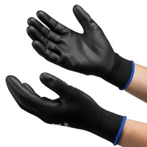 Luva de proteção, tricotada em náilon, palma, face palmar dos dedos e pontas dos dedos com revestimento em poliuretano; punho com elastano.
