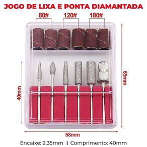 Kit Pontas Diamantadas e Tubo de Lixa 24 Peças para Micro Retíficas Manicure Dremax Jogo com 10 Pontas Diamantadas, 12 Tubos de Lixa e 2 Suportes para Tubos. Indicado para trabalhos de lixamento, molde, polimento, desbaste e gravação com micro retificas. Para manicure, artesanato, escultura, retoque, polimento e acabamento de vidro, cerâmica, mármore, pedras, aço e outros materiais duros. MATERIAIS INDICADOS: Materiais mais macios como madeira dura, madeira macia, plástico, fibra de vidro, alumínio, cerâmicas, borracha, unhas de animais, unhas artificiais, pedras e muito mais. ITENS INCLUSOS - 2 Ponta Diamantada Cilíndrica 6mm - 2 Ponta Diamantada Cilíndrica 5mm - 2 Ponta Diamantadas Cônica 4mm - 2 Ponta Diamantadas Oval 4mm - 2 Ponta Diamantadas Cônica Ponta Fina 3mm - 2 Suporte para Tubos de Lixa - 4 Tubos de Lixa 8mm Grão 80 - 4 Tubos de Lixa 8mm Grão 80 - 4 Tubos de Lixa 8mm Grão 180 ESPECIFICAÇÕES - Marca: Dremax - Modelo: KBD-12 - Diâmetros das Hastes: 2,35mm - Comprimento das Pontas Diamantadas: 27mm - Diâmetro dos Tubos de Lixa: 8mm - Indicado para micro retíficas que possuam pinça para haste de 2,35mm - : 90 dias contra defeitos de fabricação