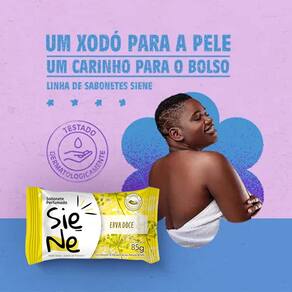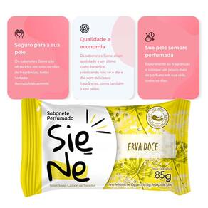 Kit 24 und Sabonete Siene Erva Doce 85g A linha de Sabonetes Siene chega para tornar o momento do banho ainda mais agradável e perfumado. São três versões modernas e suaves, dermatologicamente testadas para limpar, cuidar e trazer aquela gostosa sensação de frescor para sua pele: Proteínas do Leite, Rosas Vermelhas e Erva-Doce.