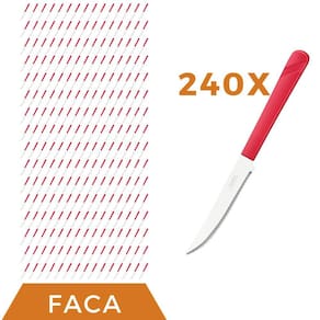 Conjunto de Facas As facas de mesa da linha Luna são um conjunto elegante e funcional para qualquer mesa de jantar. Com um cabo vermelho vibrante feito de plástico de alta qualidade, estas facas são confortáveis de segurar e fáceis de identificar em meio a outros utensílios de mesa. O aço inox de alta qualidade das lâminas garante que elas permaneçam afiadas por um longo tempo, enquanto o design elegante torna as facas uma adição atraente à sua coleção de utensílios de cozinha.