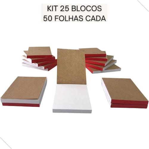 - Kit com 25 Blocos de anotações com 50 folhas, totalizando 1250 folhas - Medidas 10x7cm - Sem impressão, folhas brancas - Blocado com cola vermelha - Capa e Contra Capa em Kraft - Não possui carbono