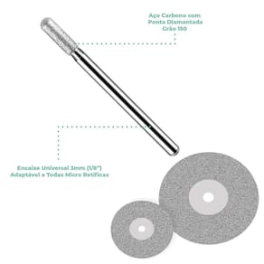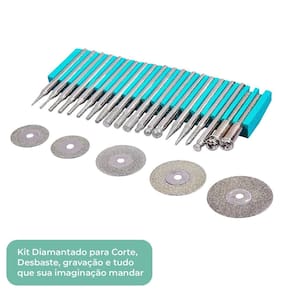 Kit discos de corte e pontas diamantadas 25 peças para micro retíficas 3mm dremax Indicado para trabalhos de corte de gravação com micro retificas. Para artesanato, escultura, retoque, polimento e acabamento de vidro, cerâmica, mármore, pedras, aço e outros materiais duros. Diferenciais: - revestidos com diamante: cada ferramenta do conjunto é revestida com diamantes genuínos, garantindo nitidez e longevidade superiores. - compatibilidade universal: possui haste de 1/8 3mm , tornando-o universalmente compatível com todas as micro retíficas do mercado Conjunto abrangente: inclui 5 discos diamantados e pontas diamantadas atendendo a uma ampla variedade de tarefas de polimento, corte e gravação Organizado e portátil: vem em uma caixa de transporte conveniente, garantindo fácil organização e portabilidade. Para várias tarefas: ideal para fabricação detalhada de joias, projetos de arte complexos e outras operações que demandem precisão. Itens inclusos - diâmetros das hastes: 3mm - diâmetro dos furos dos discos: 3mm - 2 discos de 16mm 5/8 pol. - 1 discos diamantado de 20mm 3/4 pol. - 1 disco diamantado de 22mm 15/16 pol. - 1 disco diamantado de 25mm 1 pol. - 1 ponta diamantada paralela 1mm - 1 ponta diamantada paralela 1.2mm - 1 ponta diamantada paralela 1.8mm - 1 ponta diamantada paralela 2mm - 1 ponta diamantada cabeça chata fina 1mm - 1 ponta diamantada cabeça chata fina 1.3mm - 1 ponta diamantada cabeça chata fina 2.0mm - 1 ponta diamantada cabeça chata fina 2.2mm - 1 ponta diamantada cabeça chata fina 2.4mm - 1 ponta diamantada cilíndrica 2.6mm - 1 ponta diamantada cilíndrica 3.0mm - 1 ponta diamantada cilíndrica 3.4mm - 1 ponta diamantada cilíndrica 2.6mm - 1 ponta diamantada esférica 2.0mm - 1 ponta diamantada esférica 2.4mm - 1 ponta diamantada esférica 4.0mm - 1 ponta diamantada cabeça plana 3.5mm - 1 ponta diamantada cabeça cônica 2.4mm - 2 hastes para disco Especificações - marca: dremax - modelo: kad-25 - indicado para todas as marcas de micro retíficas, como dremel, charbs, einhell, black+decker, dremax, mondial, vonder, titanium, western, ingco, gamma, wesco, etc. - peso: 104 gramas - : 90 dias contra defeitos de fabricação