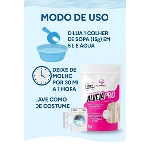 Kit com 2 AlvejaPro Quimivida 1kg Cada Brilho e Renovação das Roupas O que você vai receber: 2 unidades de AlvejaPro Quimivida 1kg Descrição do Produto: O AlvejaPro Quimivida é um reforçador de lavagem com ação do oxigênio ativo, desenvolvido para ajudar na remoção de manchas do dia a dia como café, vinho, suor e encardidos. Sua fórmula à base de percarbonato de sódio cuida dos tecidos, mantendo as roupas mais claras, coloridas e com aparência renovada, sem uso de cloro. Benefícios: Fórmula com oxigênio ativo que ajuda na remoção de manchas. Realça o branco e mantém cores mais vivas. Indicado para roupas de cama, mesa, banho e uso diário. Pode ser em máquinas de lavar ou em tanques. Produto versátil: auxilia também em lavagens de tecidos delicados. Não agride as fibras dos tecidos. Embalagem econômica de 1kg cada. Modo de Uso: Pré-lavagem: dissolva cerca de 15g em 1 litro de água morna e deixe a peça de molho por até 30 minutos. Lavagem em máquina: adicione 1 a 2 colheres de sopa junto com o sabão de sua preferência. Para melhores resultados, utilize água morna. Manchas localizadas: prepare uma pastinha com o produto e água, aplique sobre a mancha e aguarde alguns minutos antes de lavar. Observações Importantes: Recomendado sempre testar em uma pequena área da peça antes do uso. Armazenar em local seco, fresco e ao abrigo da luz.