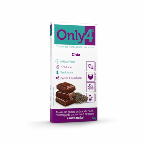 Chocolate 70% Cacau com Chia Sem Lactose Vegano Only4 tem em sua composição base apenas 4 ingredientes, é indicada para pessoas que amam chocolates mais leves. Sem adoçantes ou açúcar refinado e mais suave comparado a outras marcas com o mesmo teor.