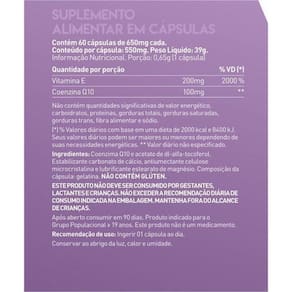 Ingredientes: Acetato de DL-Alfa Tocoferol Vitamina E , Coenzima Q10 ubiÉuinoI e ubiquinona e Triglicerídeos de Cadeia Média TCM . Composição da Cápsula: Gelatina, umectante êlicerina e água purificada.NÃO CONTEM GLÚTEN. Ean: 7898387242549