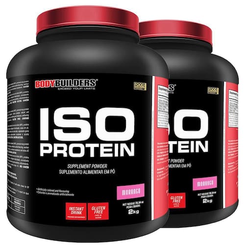 Kit 2X Iso Protein 2Kg Morango - BodybuildersO que é Iso ProteinO Iso Protein Bodybuilders é um suplemento proteico em pó que reúne as principais fontes de proteínas de alto valor biológico que complementam os perfis de aminoácidos necessários no dia a dia. Com a combinação da proteína do soro do leite, proteína isolada da soja e colágeno hidrolisado, o suplemento Iso Protein auxilia no favorecimento do ganho de massa muscular magra e força muscular, além de contribuir para o aumento e a capacidade do corpo de reparar músculos no período pós-treino.Com preparo rápido, fácil e prático, com a opção de 3 deliciosos sabores: Baunilha, Chocolate e Morango, o Iso Protein Bodybuilders se tornará um aliado no seu cotidiano.Isento de registro - RCD 27/2010 ANVISA .