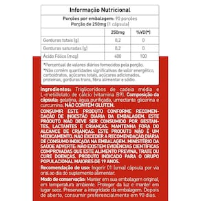 Ingredientes: triglicerídeos de cadeia média e l-metilfolato de cálcio vitamina b9 . Composição da cápsula: gelatina, água, purificada, umectante glicerina e curcumina. Não contém glúten.