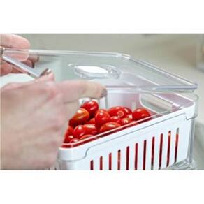 Detalhes dos produtos: - Os organizadores possuem cesto e bandeja de drenagem que evitam que os alimentos fiquem molhados após a lavagem, ajudando a prevenir a deterioração precoce; - As tampas com respiradouros dos organizadores mantém o nível de umidade ideal para cada tipo de alimento, mantendo-os frescos por mais tempo; - O cesto de drenagem dispõe de alças laterais que facilitam o transporte e manuseio; - Possuem total transparência para você enxergar o conteúdo e manter tudo em ordem; - Não suportam micro-ondas; - Livres de bisphenol A; - Não suportam freezer; - Suportam geladeira; - Empilháveis.