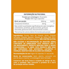 Ingredientes: extrato seco de própolis verde, própolis vermelho, própolis marrom, dióxido de silício ins 551 . Não contém glúten.