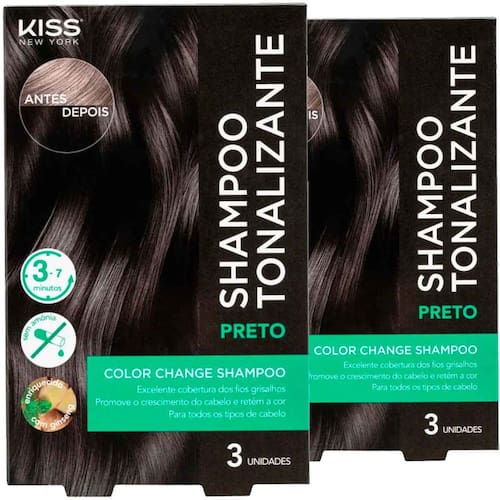Descubra o poder do Kit 2x Shampoo Tonalizante Color Change Preto Kiss New York, ideal para quem busca cobertura eficaz dos fios grisalhos com praticidade e rapidez. Em apenas 3 a 7 minutos, seu cabelo ganha uma tonalidade preta intensa e uniforme, realçando a beleza natural e promovendo um visual renovado. Enriquecido com ginseng, o shampoo fortalece as raízes e estimula o crescimento saudável dos fios, garantindo mais vitalidade. Livre de amônia, oferece um cuidado delicado, adequado para todos os tipos de cabelo.