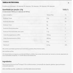 Ingredientes: óleo de peixe ômega-3 e dialfatocoferol. Composição da cápsula: gelatina, água purificada e umectante glicerina. Não contém glúten.