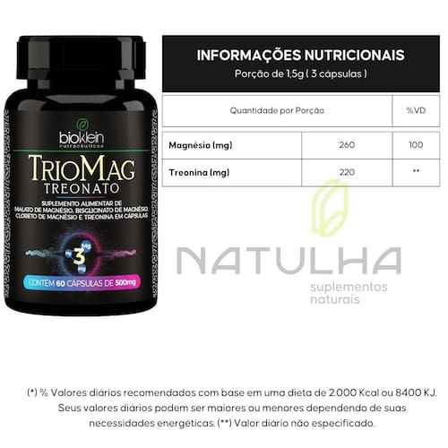 Kit 2x triomag treonato 500mg - bioklein kit com 2 unidades de triomag treonato da marca bioklein com 500mg cada. Uma nutrição equilibrada tem um papel muito importante na qualidade de vida. Com o ritmo acelerado de muitas pessoas, às vezes, é muito difícil prestar atenção a todos os requisitos que o corpo precisa para estar saudável e forte. Neste sentido, os suplementos cumprem a função de complementar a alimentação e ajudam a obter as vitaminas, minerais, proteínas e outros componentes indispensáveis para o correto funcionamento do organismo. Como tomar sugere-se a ingestão de 1 uma cápsula deste produto 3 três vezes ao dia, preferencialmente junto das principais refeições, ou de acordo com orientação profissional. Tabela nutricional porção de 1,5g 3 cápsulas