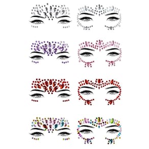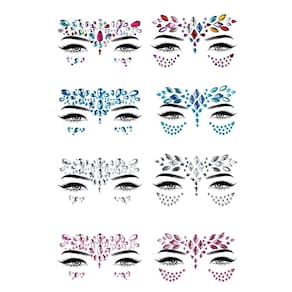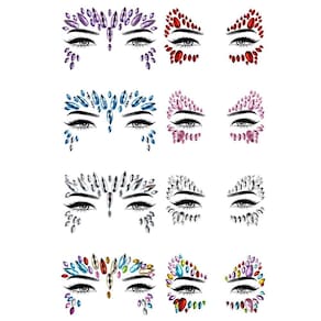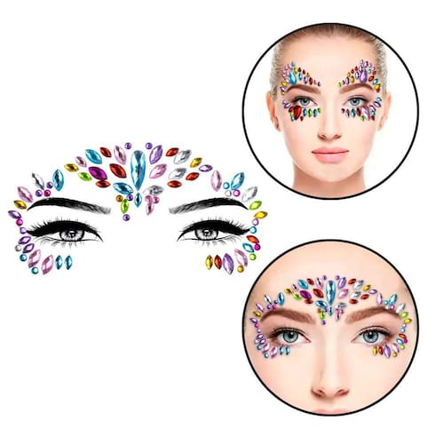 Características Principais: -Adesivo autocolante; -3 Modelos diferentes dentro do mesmo kit; -Cola duradoura; -Pedraria que não se desgruda do adesivo; -Possui uma camada adesiva que une toda a pedraria, alguns modelos são divididos em mais partes para a aplicação abaixo dos olhos; -Tamanho ergonômico para o rosto, podendo ser ajustado com recorte.