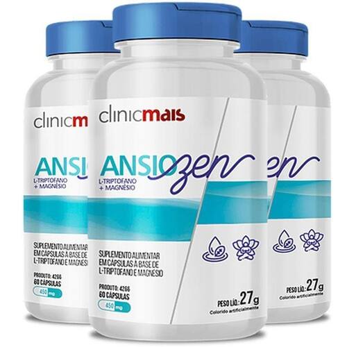 Kit 3 ansiozen l-triptofano e magnésio clinicmais 60 cápsulas ingredientes: magnésio óxido de magnésio , l-triptofano. Excipiente: amido. Antiumectante: dióxido de silício.. Composição da cápsula: gelatina, corantes: dióxido de titânio, azul brilhante e vermelho 40. Colorido artificialmente. Não contém glúten. Recomendações de uso Indicação: indivíduos com idade maior ou igual a 19 anos. Sugestão de consumo: ingerir 1 cápsula ao dia. Este produto não é um . Não exceder a recomendação diária de consumo indicada na embalagem. Mantenha fora do alcance de crianças. Marca: Não Informado