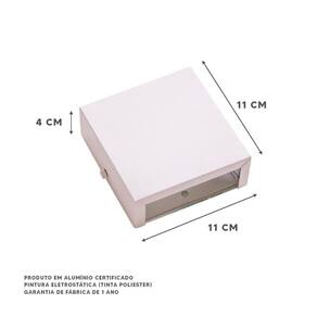 Especificações Técnicas: Marca: Ideallume Modelo: Ar1110 Fixação: Parede/Muro Tipo de uso: Interno e Externo Pintura: Eletrostática - Tinta: microtextura poliéster Cor: Branco Material Da Arandela: Alumínio e vidro. Voltagem Da Arandela: Bivolt 110/220v Soquete: G9 Halopin Medidas L x A x P : 11 x 11 x 4 cm Lâmpada: Utiliza 1 lâmpada Não inclusa