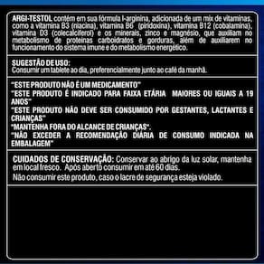 Argi testol h plus 60 tablets fisionutri kit 3 potesComposio:L-arginina, xido de magnsio, sulfato de zinco monohidratado, vitamina b3, vitamina b12, vitamina b6, vitamina d3, excipiente q.S.P. estearato de magnsio, celulose microcristalina, fosfato triclcico, dixido de silcio .Alrgicos: pode conter traos de derivados do leite, da soja e do ovo. No contm glten.Apresentao:Frasco com 60 tablets.Sugesto de uso:Ingerir 1 tablet ao dia.Conservao:Aps aberto, manter a embalagem bem fechada e armazenar em local fresco e ao abrigo de luz.Produto lacrado para sua proteo. No utilizar em caso de violao. Manter fora do alcance de crianas.produto dispensado de registro conforme rdc 27/2010.