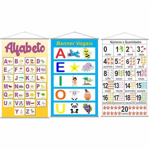Os Banners Pedagógicos são excelentes para trabalhar de uma forma interativa o desenvolvimento dos alunos, facilitando na hora de ensinar e memorizar cada passo.Kit de Banners Pedagógicos com:- 1 um Alfabetário 4 Letras- 1 um Alfabetário de Vogais- 1 um Numerais até 20ESPECIFICAÇÕES:Lona Vinílica altamente resistente com tamanho de 80x50cm. Imagens com alta resolução de impressão em acabamento de bastões e corda, pronto para pendurar.Acabamento: Bastões de madeira + corda na parte superior.
