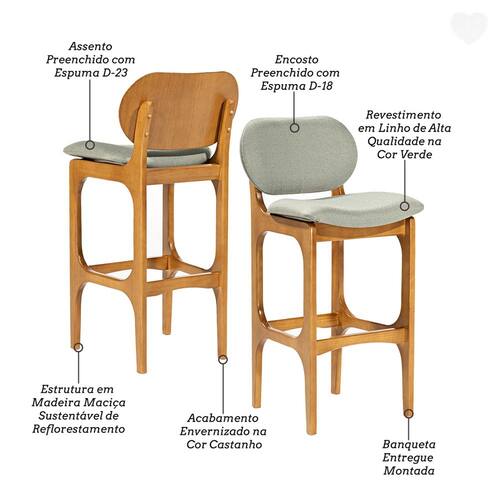 CARACTERÍSTICA TÉCNICAS: - Produzido em Madeira Maciça de Reflorestamento - Acabamento em Verniz na cor Castanho - Assento Estofado Preenchido com Espuma D-23 - Encosto Estofado Preenchido com Espuma D-18 - Tecido de Alta Qualidade em Linho na cor Verde L84 - Banqueta Entregue Montado - Kit Composto por TRÊS Banquetas Rafine