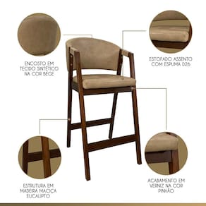 CARACTERÍSTICAS TÉCNICAS: - Produzido em Madeira Maciça; - Acabamento Verniz na Cor Pinhão; - Assento com Espuma D26; - Encosto com Espuma D23; - Revestido em Tecido Material Sintético na Cor Bege.