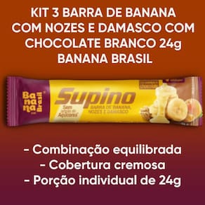 Kit 3 Barra de Banana com Nozes e Damasco com Cobertura de Chocolate Branco 24g - Banana Brasil Um mix sofisticado de frutas e nuts A Banana Brasil combina a suavidade da banana, o toque agridoce do damasco e a crocância das nozes, tudo envolto em uma camada cremosa de chocolate branco. Uma experiência marcante que une diferentes texturas e sabores em um só produto. Descrição principal Com 24g em formato prático, esta barra reúne ingredientes selecionados que harmonizam perfeitamente: a banana adocicada, o damasco levemente ácido e as nozes crocantes. A cobertura de chocolate branco acrescenta suavidade e equilíbrio, tornando cada mordida irresistível. É a escolha perfeita para quem busca inovação em lanches rápidos, sobremesas individuais ou momentos de pausa cheios de sabor. Sugestões de uso - Como lanche prático no dia a dia - Para acompanhar cafés, chás ou outras bebidas - Como uma sobremesa saborosa e individual Destaques do produto - Combinação equilibrada de banana, damasco e nozes - Cobertura cremosa de chocolate branco - Porção individual de 24g, ideal para qualquer momento - Textura que une suavidade e crocância - Produzida pela Banana Brasil, referência em snacks criativos Ingredientes Banana desidratada, damasco desidratado, nozes, cobertura sabor chocolate branco açúcar, gordura vegetal, leite em pó integral, soro de leite em pó, emulsificante lecitina de soja e aromatizante . Informações para alérgicos Contém leite, soja e nozes. Pode conter traços de amendoim, castanhas e glúten. Modo de armazenar Conservar em local fresco, seco e protegido da luz. Após aberto, consumir imediatamente para melhor aproveitamento do produto. Marca: Não Informado
