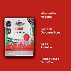 Kit 3 bebida mini sabor morango 200ml a tal da castanha o kit 3 bebidas mini sabor morango 200 ml - a tal da castanha reúne três unidades práticas e saborosas que combinam a suavidade das castanhas com o frescor adocicado do morango. Esta bebida vegetal é perfeita para quem procura uma opção equilibrada, cremosa e naturalmente aromática, ideal para consumo diário em diferentes momentos da rotina. Produzida com castanhas cuidadosamente selecionadas e morangos de alta qualidade, essa bebida mantém o compromisso da marca a tal da castanha em valorizar ingredientes puros, sem conservantes artificiais e com um perfil de sabor autêntico. A combinação da cremosidade das castanhas com o toque frutado do morango resulta em uma experiência sensorial delicada e versátil, que agrada tanto crianças quanto adultos. O kit com três garrafinhas de 200 ml é prático e pensado para facilitar o consumo individual, podendo ser transportado com facilidade na lancheira, bolsa ou mochila. Ideal para o dia a dia, ele se adapta a diferentes ocasiões: lanches rápidos, pausas no trabalho, momentos de lazer ou como acompanhamento em cafés da manhã mais leves. Além disso, é uma ótima opção para compor cestas de presentes e kits personalizados junto a outros produtos naturais. Versátil, a bebida pode ser apreciada pura, gelada para refrescar em dias quentes ou aquecida para momentos mais aconchegantes. Também pode ser utilizada como base para receitas criativas, como vitaminas, smoothies, sobremesas ou misturas artesanais, agregando um sabor frutado e delicado que se destaca pela naturalidade e equilíbrio. Informações para alérgicos Contém castanhas. Não contém glúten e não contém lactose. Pode conter traços de outras oleaginosas processadas no mesmo local Modo de armazenar Conservar em local fresco, seco e protegido da luz solar. Alérgicos: contém castanha de caju e derivados de aveia. Não contém glúten. Sobre a tal da castanha a família de alimentos plant-based mais natural. Em cada produto, uma receita para um mundo melhor. A tal da castanha é muito mais que uma marca de alimentos: além de produzir alimentos com ingredientes reais e não artificiais, respeita e valoriza as pessoas, os animais e a natureza. Através deles, gera impactos positivos na sociedade, nas economia e no meio ambiente. Como tomar Este produto não deve ser para alimentar crianças menores de 1 um ano de idade. O aleitamento materno evita infecções e alergias e é recomendado até os 2 dois anos de idade ou mais. Quando tomar Conservar em local arejado, seco e/ou refrigerado. Após aberto, consumir imediatamente.