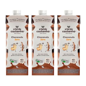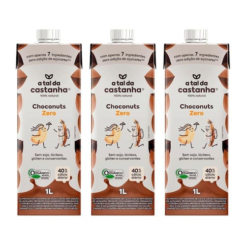 Kit 3 achocolatado choconuts zero 1l - a tal da castanha o choconuts zero é a alternativa vegetal perfeita para quem busca sabor e saúde. Livre de lácteos, transgênicos, glúten e soja, ele é ideal para crianças e adultos com restrições alimentares. Além disso, seu processo de produção utiliza menos recursos naturais e emite menos gases de efeito estufa, tornando-o uma escolha sustentável para o planeta. Uma kit 3 bebida deliciosa e consciente, sem ingredientes de origem animal.