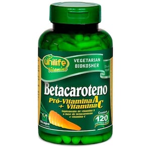 Betacaroteno da Unilife Vitamins é um suplemento em cápsulas à base de betacaroteno pró-vitamina A e vitamina C.