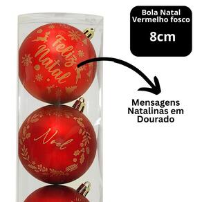 Com 8cm de diâmetro, essas bolas têm o tamanho ideal para árvores de médio a grande porte, e também podem ser usadas em guirlandas, arranjos ou em cestas decorativas. O acabamento fosco em vermelho profundo, combinado com a escrita dourada, traz um contraste refinado que valoriza qualquer ambiente.